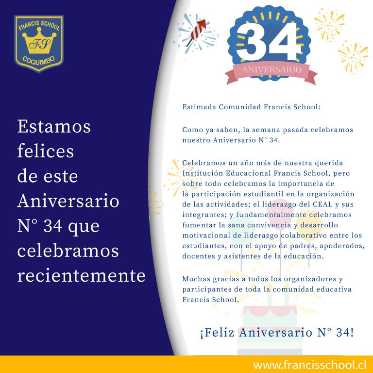 Estimada Comunidad Francis School: Como ya saben, la semana pasada celebramos nuestro Aniversario N° 34. Celebramos un año más de nuestra querida Institución Educacional Francis School, pero sobre todo celebramos la importancia de la participación estudiantil en la organización de …