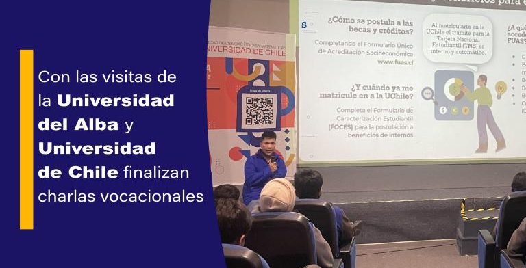 En las recientes semanas nos han visitado representantes de la Universidad Regional del Alba y de la Universidad de Chile, ambas universidades han ofrecido charlas extensivas a la experiencia universitaria, dando a conocer becas, créditos y ofertas académicas a nivel regional y nacional. En este mismo contexto, recibimos la visita de la encargada de Difusión de Regiones de la Universidad de Chile, nuestra ex alumna, la señorita Carolina Álvarez, quien también es estudiante de ingeniería en minas en la Universidad de Chile y nos contó su experiencia y compartió gratos momentos con nuestros estudiantes.