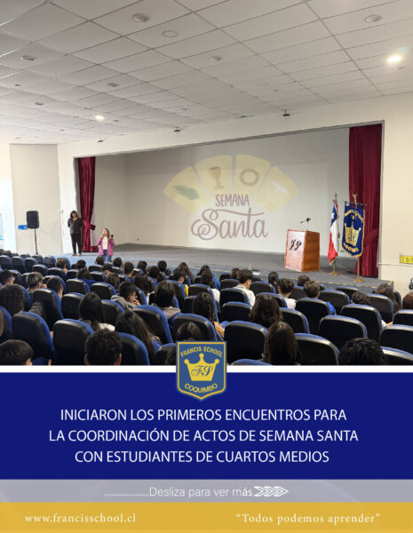 Con entusiasmo y espíritu de colaboración, se han llevado a cabo los primeros encuentros con los estudiantes de cuarto medio para dar inicio a la organización de los actos conmemorativos de Semana Santa. Estas reuniones marcan el punto de partida para que la generación saliente lidere las actividades, aportando su visión y compromiso en esta etapa final de su vida escolar. La coordinación de este proceso está a cargo del Departamento de Filosofía y Religión, quienes acompañarán a los jóvenes en la creación de espacios de reflexión y comunidad para todo el colegio.
