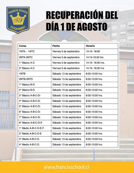 Se informa que según el calendario de recuperación, las clases suspendidas el día 1 de agosto serán recuperadas el día viernes 5 y sábado 13 de septiembre, según el nivel que corresponda indicado en la tabla.