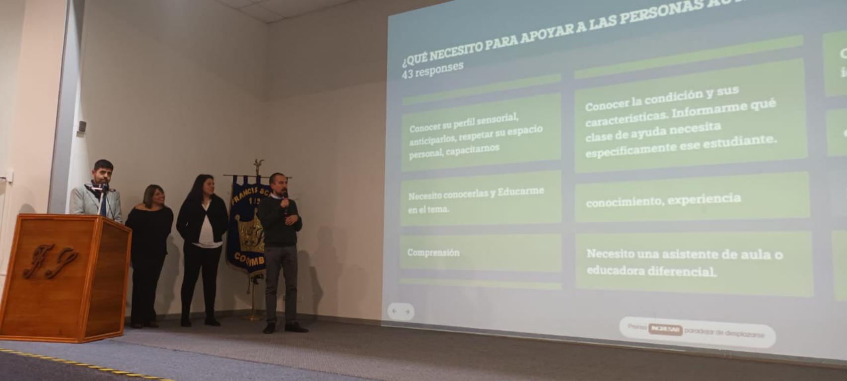 El pasado miércoles 20 de marzo, se llevó a cabo un taller teórico práctico en el Consejo de Profesores a cargo del Programa de Inclusión Escolar. Los docentes y profesionales participaron en una jornada muy provechosa, ya que conocieron diversas implicancias de la circular 586 y ley 21.545, más conocida como “Ley de Autismo”. Además, se entregaron estrategias de apoyo a los y las estudiantes para favorecer su inclusión y plena participación en el ámbito educativo.